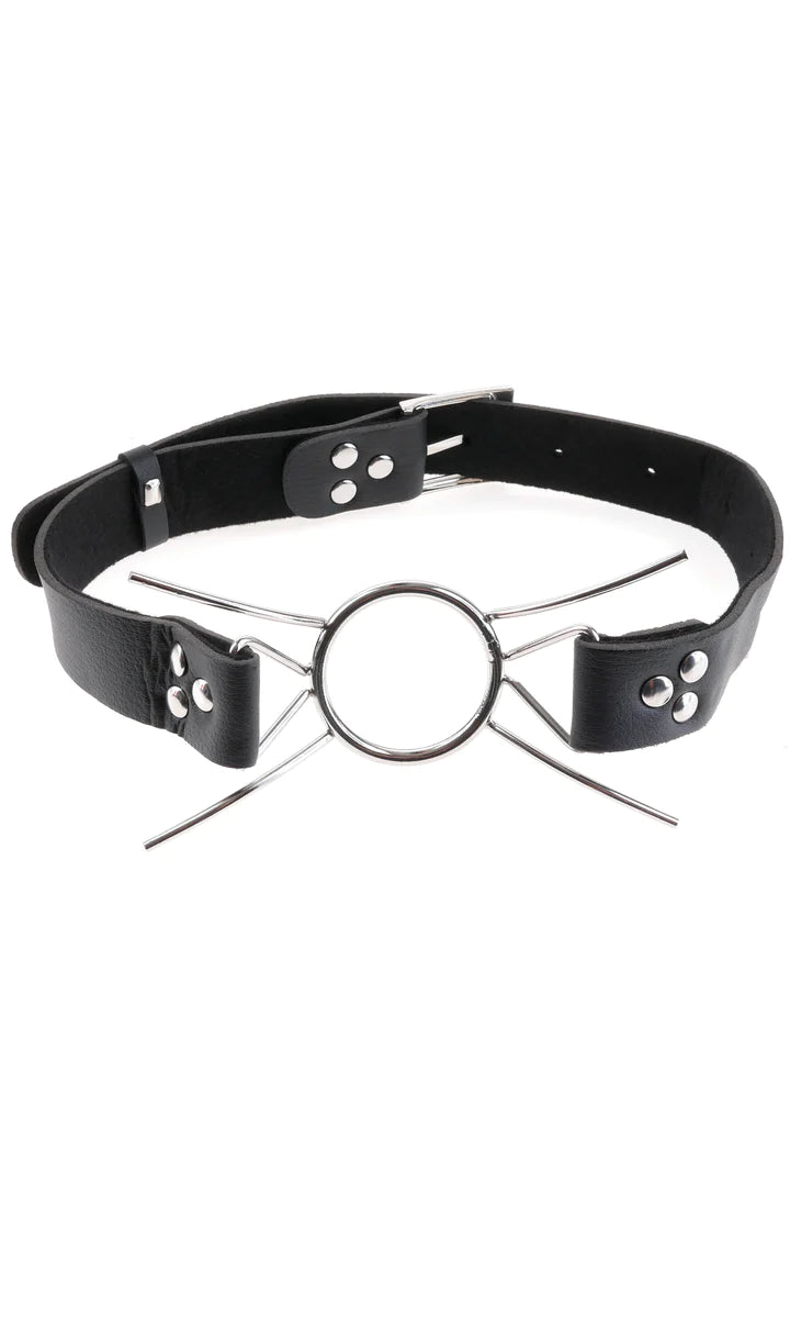 When wide-open isn't wide enough, the Fetish Fantasy Extreme® Spider Gag will get the job done! This extreme gag consists of a steel ring with four curved metal "legs" attached to the ring. The gag and legs prevent the mouth from closing, leaving your subject's mouth wide open for whatever you wish to put in it. The diameter of the ring measures 1.5", and the gag connects to a leather strap that buckles in the back and keeps the gag firmly in place.
