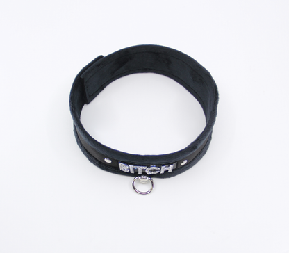 Soft & fluffy collar embellished with the word ‘BITCH’ in diamanté lettering. Collar features Velcro fastening for the perfect fit & features a centre ring attached by rotating toggle hardware for complete freedom of movement. Why not make it a set? This collar has matching wrist cuffs & blindfold.