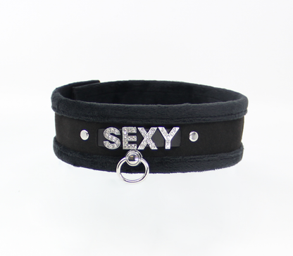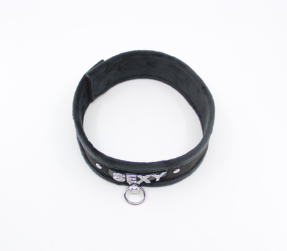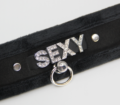 Soft & fluffy collar embellished with the word ‘SEXY’ in diamanté lettering. Collar features Velcro fastening for the perfect fit & features a centre ring attached by rotating toggle hardware for complete freedom of movement. Why not make it a set? This collar has matching wrist cuffs & blindfold.