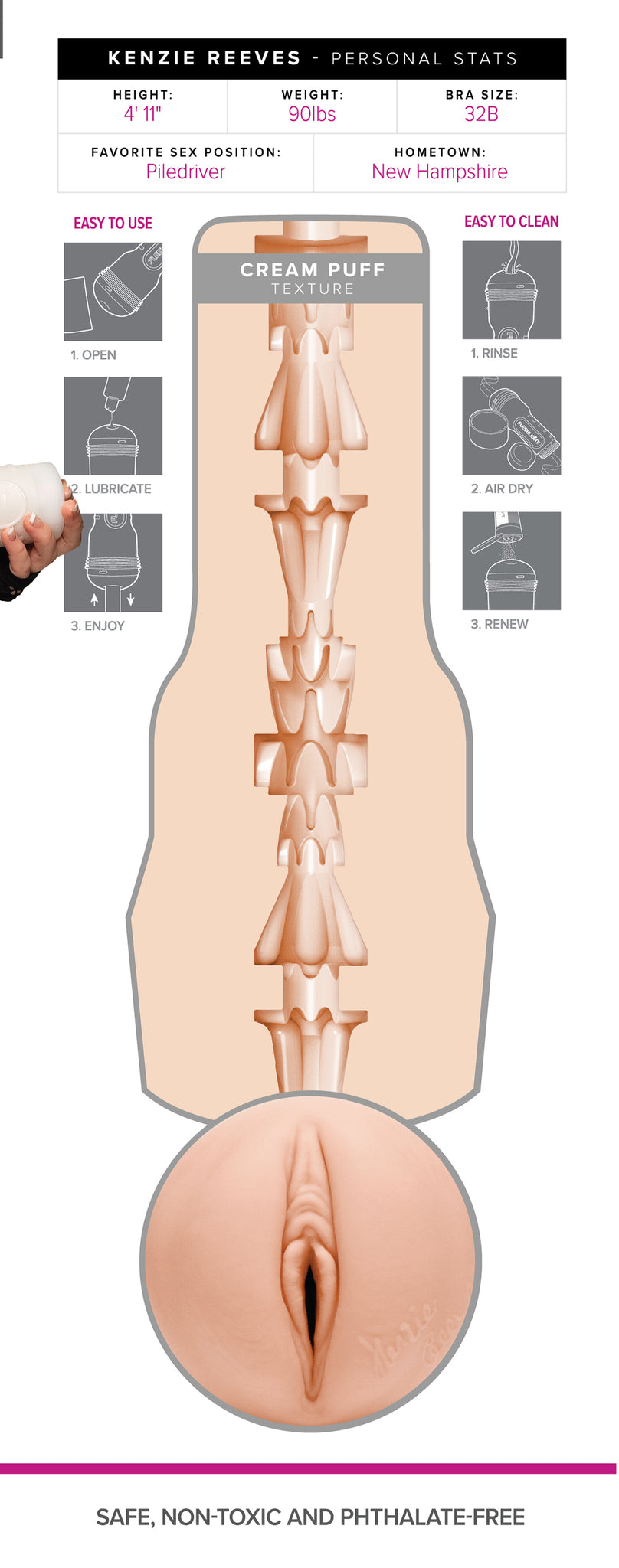 You’ve never been inside a pussy this puffy before! Lube up and slide in between Kenzie Reeves’ tight, thin lips and experience a narrow inner texture designed for an overwhelming gripping and sucking sensation. This sex toy’s multi-chambered build and never-before-seen structures make this a can’t-miss pussy-crushing experience.