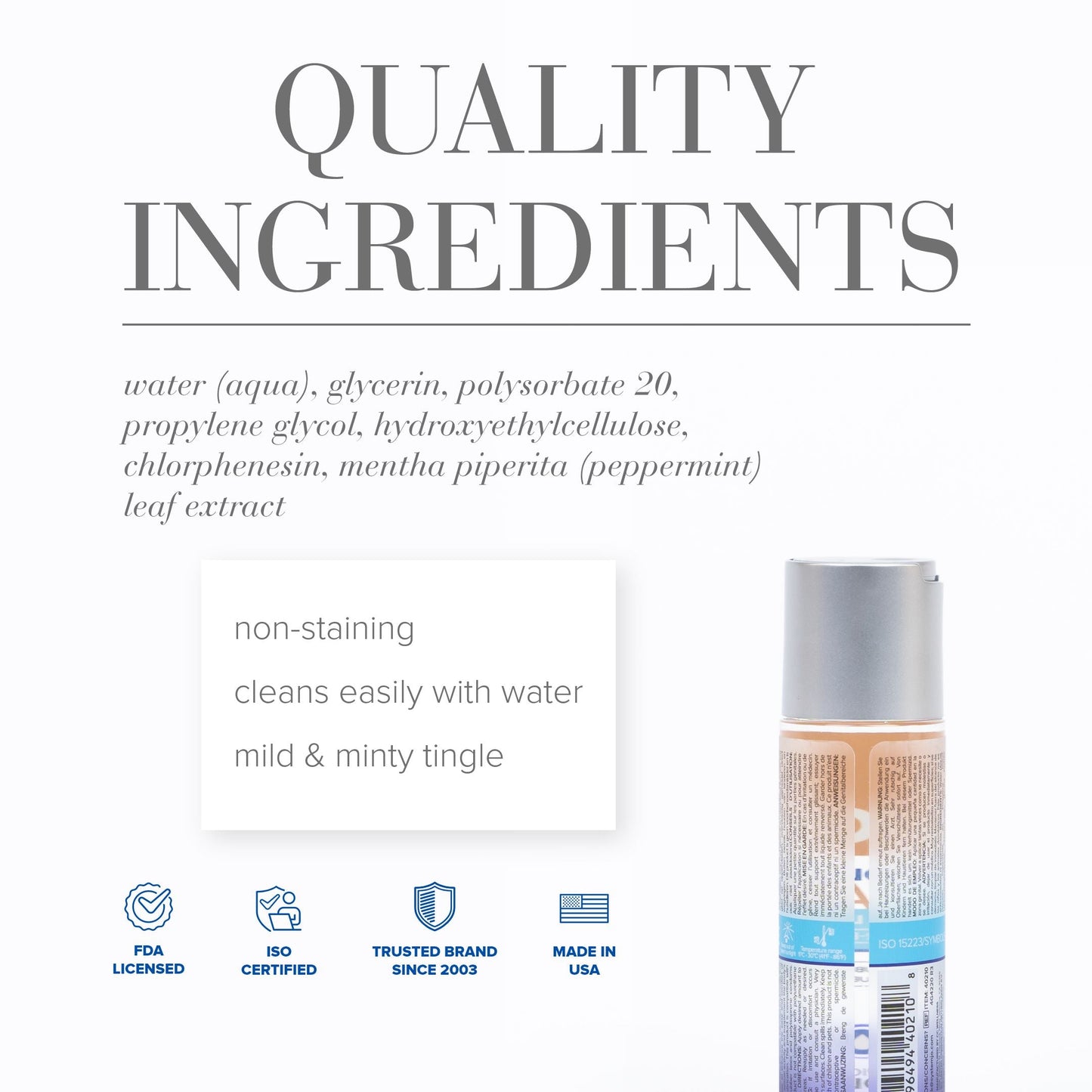 Cooling: Water (Aqua), Glycerine, Polysorbate 20, Propylene Glycol, Hydroxyethylcellulose, Chlorphenesin, Mentha Piperita (Peppermint) Leaf Extract, Sodium Hydroxide