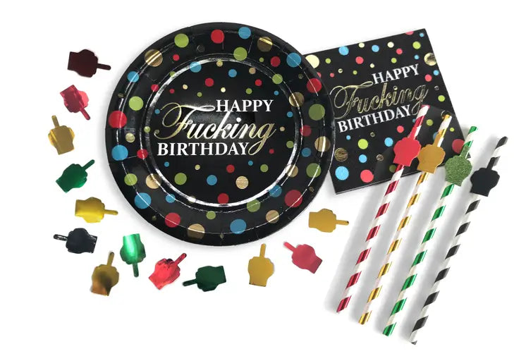 Happy Fucking Birthday line of partywares are approved by anyone with a good sense of humour enjoys a good laugh on their special day! This line of hilarious party products has been regarded by media outlets worldwide as the “Official line of adult-themed party products of 2022”. This beautifully patterned line of tableware and playful decor features metallic high quality fuck you finger confetti. Turn your next ordinary party into a fucking high class function with any of our fine party products. Complete this look with coordinating Happy Fucking Birthday plates, napkins, straws, candles, games and more!