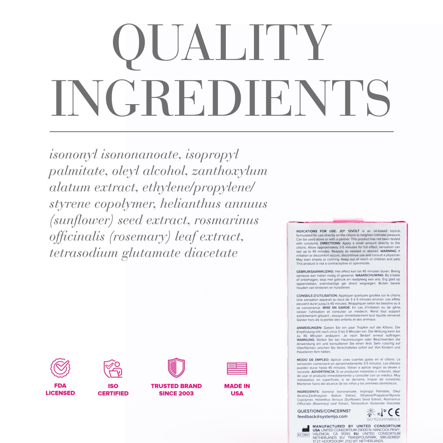 JO® VOLT is an oil-based topical formula designed to stimulate and heighten sensual pleasure with a thrilling buzzing sensation. The light serum is designed to enhance libido, touch sensation and sensitivity during foreplay and solo-play. This formula is also preservative free and antioxidant infused.