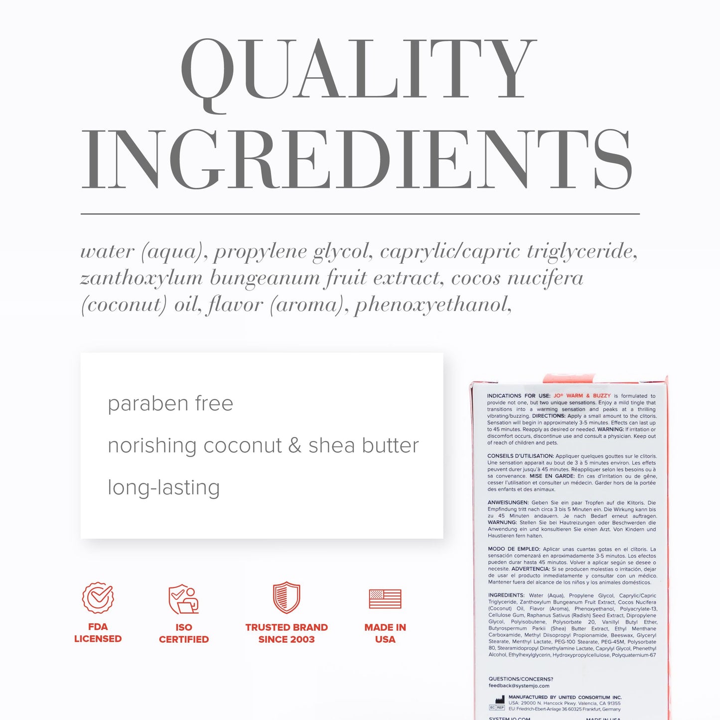 Vanillyl Butyl Ether: Commonly used to impart a sensation of warmth upon application. This ingredient is highly regarded for being a milder warming agent for personal applications and is gentle on the skin.
