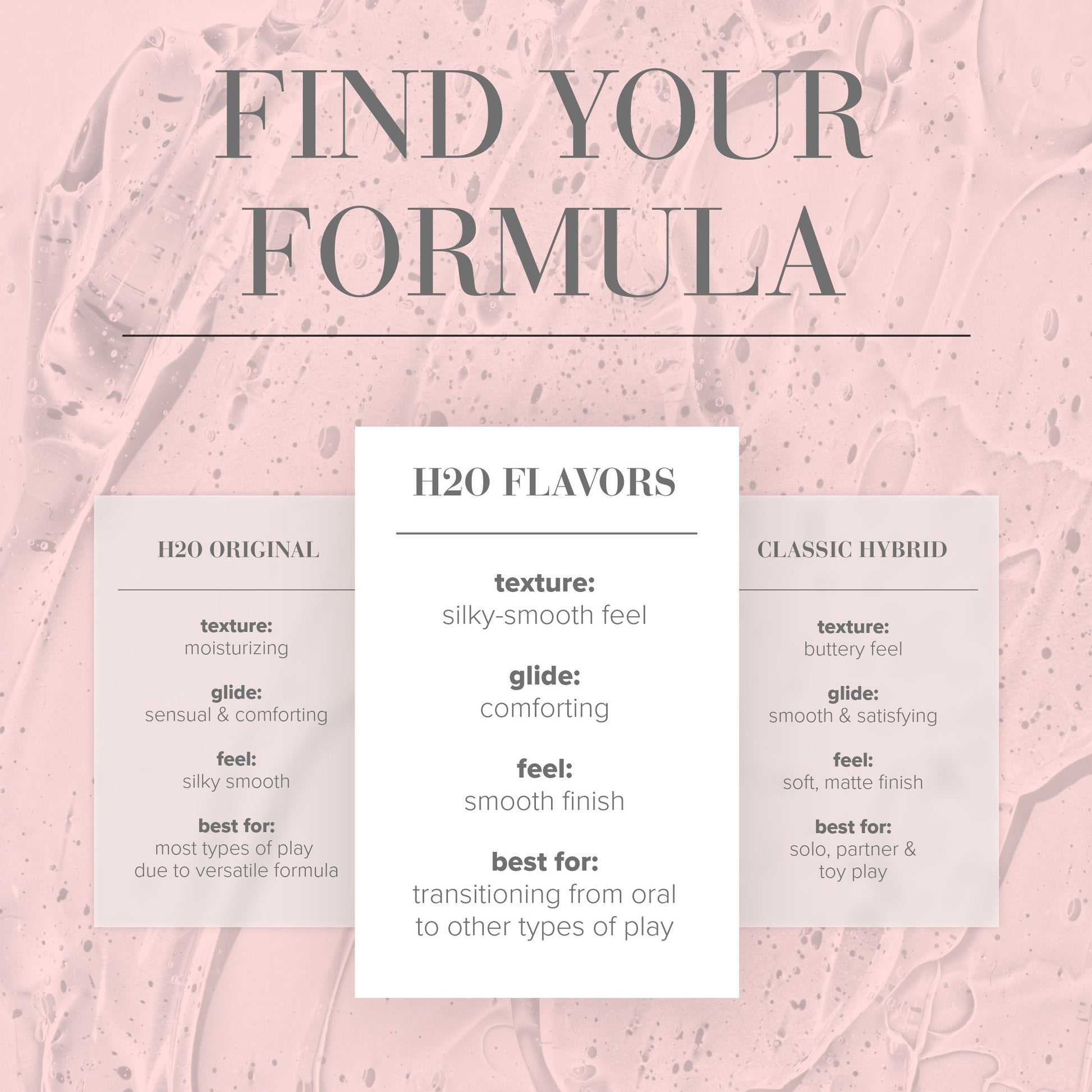 The JO® H2O FLAVOURED COLLECTION offers a flavourful array of personal lubricants designed to enhance foreplay and intimacy. Formulated with a pure plant-based glycerine and infused with natural flavour extracts, this collection will excite the taste buds and appetite for pleasure. No added sugar or artificial sweeteners also make this a guilt-free addition to bedroom play!