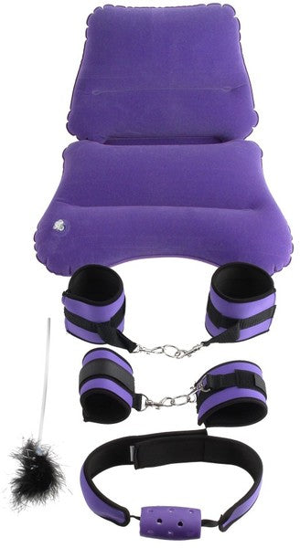 Keep your lover quiet and under control with this playful Purple Pleasure Bondage Set. Perfect for beginners and enthusiasts alike, this sexy set of cuffs and a ball gag puts a seductive twist on bondage play by combing two classic favorites. The soft neoprene cuffs adjust to fit most sizes and connect using a heavy duty metal o-ring and clips. The breathable ball gag uses a neoprene strap to adjust and fit snugly, controlling when and how often your lover speaks. Secure your lover, take control, and explore your Fetish Fantasies! Inflate the love cushion and try new positions you never thought were possible! The set also includes a soft feather streamer that's sure to tease and titillate!