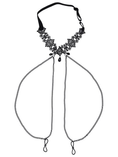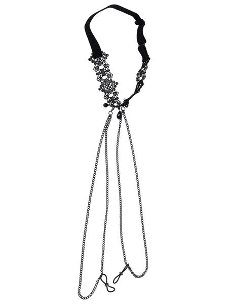 The Lace Collar with Nipple Ties is designed for those who crave a touch of the unexpected. This ornate lace collar wraps comfortably around the neck, featuring an adjustable bra-strap-style back for the perfect fit. Glistening black gemstones dangle delicately from the collar, drawing attention to the neckline while adding a touch of mystery. The black dual draping chains connect effortlessly to adjustable nipple ties, offering a subtle yet seductive thrill. Designed to be stylish, sexy, and discreet, and perfect for those looking to turn up the heat whether in public or behind closed doors.
